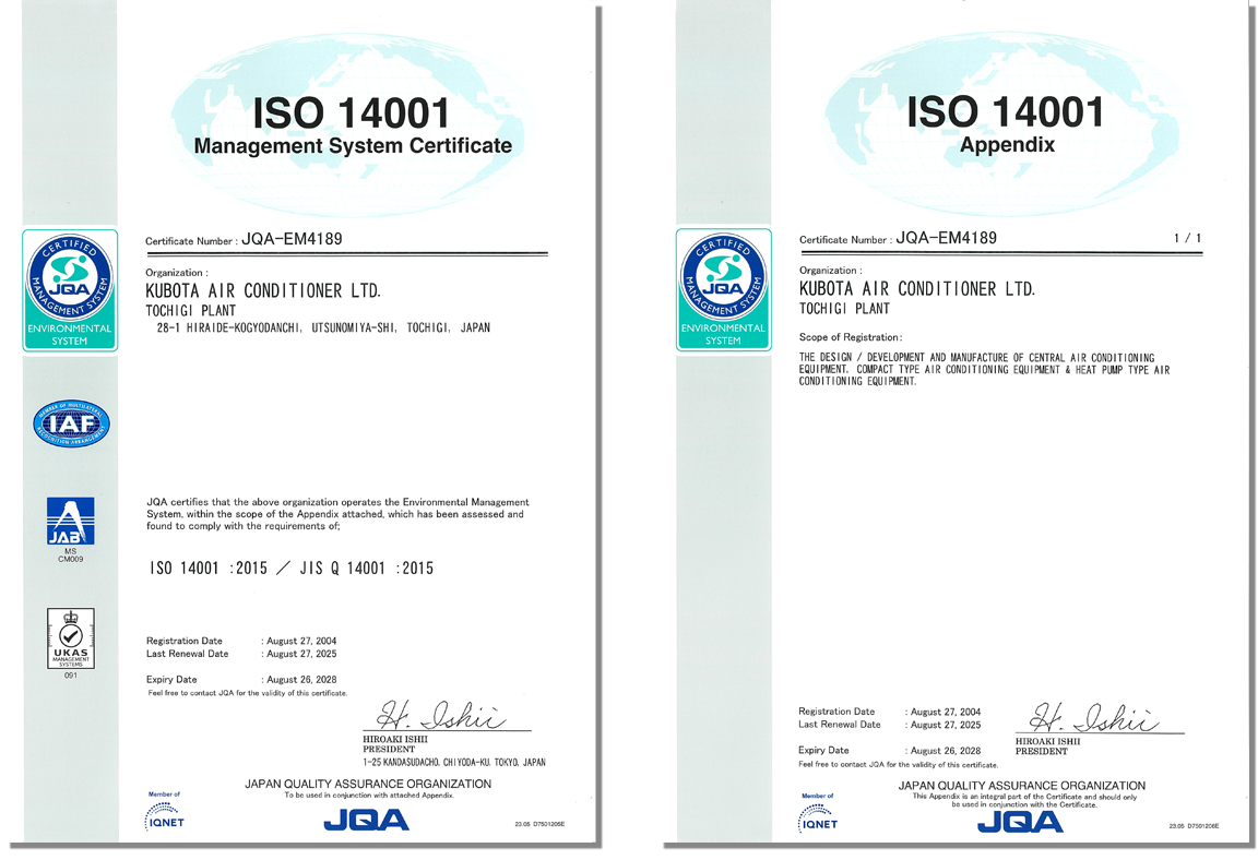 We also supply AHU that completely clear the requirements of the RoHS Directive. In addition, the Tochigi Plant acquired ISO 14001 certification in 2004 and works based on a management program to set targets and follow the PDCA cycle to reduce its environmental load.