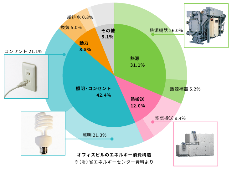 私たちが働いているオフィスビルのエネルギーの消費構造を調べてみると熱源系を含む空調設備に大きな割合があることがわかります。(下図参照)