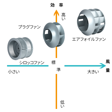 省エネには高効率の送風機を選ぶことが重要です。効率の高いプラグファン・エアフォイルファンを選定することで動力を削減することができます。当社で豊富な種類の送風機の中から最適なものを選定します。