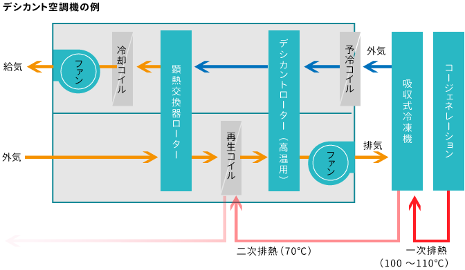 コージェネレーション設備の一次排熱など高温排熱は有効利用の対象として研究・再利用されてきましたが、再利用後の二次排熱や、ヒートポンプのコンデンサーなどから発生する排熱は温度が低く利用が困難とされていました。この「低温排熱」を有効利用し省エネルギーを図る製品を研究・開発・商品化しました。コージェネ二次排熱を利用し低温再生デシカントローターと顕熱交換器を組み合わせることで冷却負荷を50%削減した実績もあります。