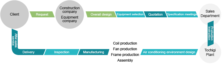 Ever since the start of our air conditioning business in 1970, all of the Kubota AHU have been made in integrated production at our Tochigi Plant. The plant has a range of equipment with multiple adaptations to be able to produce the high quality products required by customers with high efficiency. It continues to supply superior air conditioning products which pursue both performance and reliability, with a process that starts from the optimal selections by a computer and goes through design using CAD, production utilizing state-of-the-art equipment, and many steps of strict quality management.