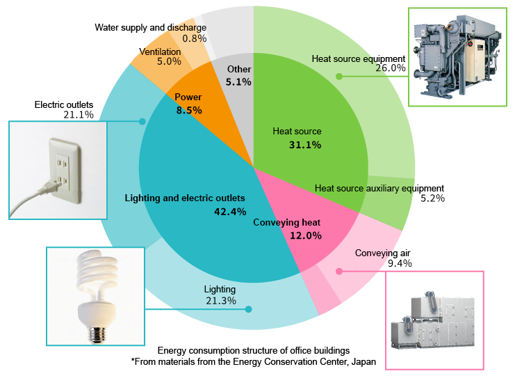 If we investigate the structure of the energy consumption in the office buildings where we work, we can see that a large proportion of the energy is used for heat source systems and other air conditioning equipment. (See figure below)