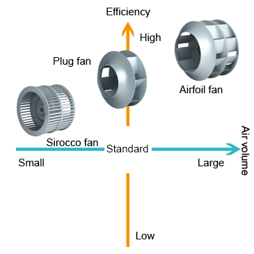 The selection of a highly efficient fan is very important for energy saving. It is possible to reduce the power by selecting high efficiency plug fans and airfoil fans. We select the optimal items from a large variety of fans.