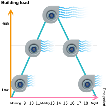 The building load varies greatly depending on the weather on a particular day, the time and the season. The air volume is designed for the peak load, so reducing the air volume when the load is low can greatly reduce the conveyance energy. Rotation speed control using an inverter can lead to particularly large energy-saving.