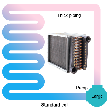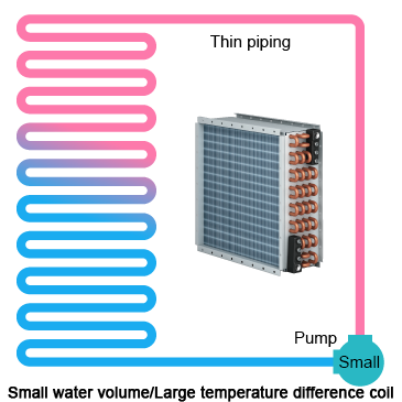 In conveyance energy, a large factor equivalent to the power for air conveyance is the power for water supply. One way to reduce this power consumption is to increase the temperature difference between the entering and leaving of the water and reduce the water flow rate. However, when this method is considered from the side of the AHU coil, there is the problem that the water velocity in the tube is reduced and so the heat transfer coefficient declines. Kubota handles this problem by using a wide range of “Small water flow/Large temperature difference coils” that can secure the appropriate water velocity inside the tube, even if the water flow is small.