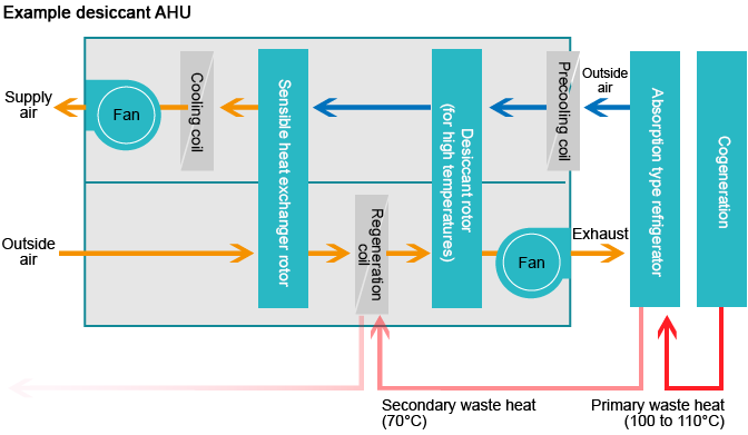 Research has been performed for the effective use of high temperature waste heat such as the primary waste heat from cogeneration equipment and that heat is reused. However, the secondary waste heat after that reuse and the waste heat generated from items such as heat pump condensers has a low temperature and its reuse has been considered to be difficult. We have researched, developed and commercialized products that aim for energy saving through the effective use of this “low temperature waste heat.” We also have a proven record of reducing the cooling load by 50% by reusing the secondary waste heat of cogeneration and combining a low temperature regeneration desiccant rotor and a sensible heat exchanger.