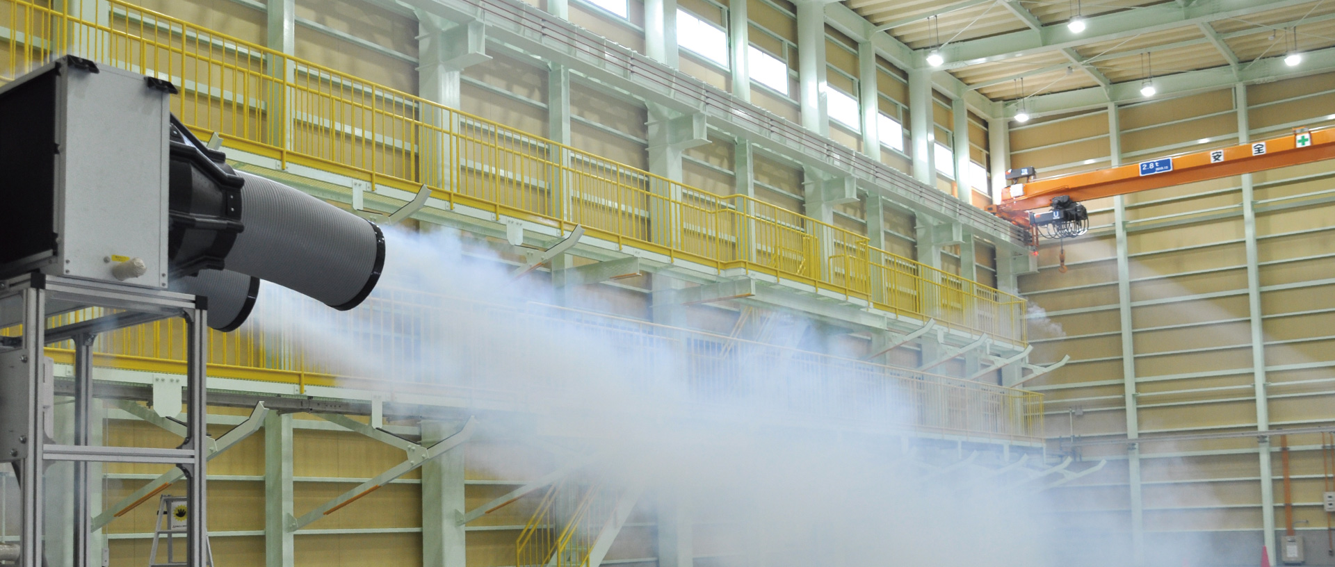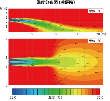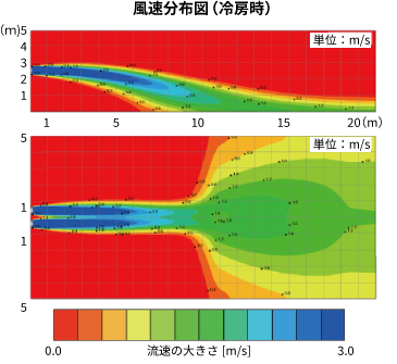 10HP(馬力)で最大130m3/minの風を放出します。20m先まで風速1m/sの風を届けることができるので広範囲な施設でも対応することが可能です。