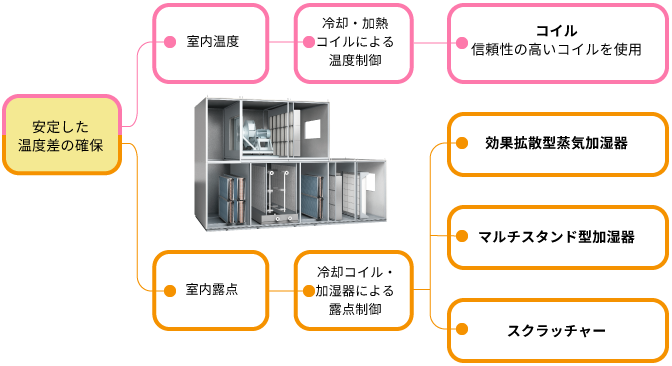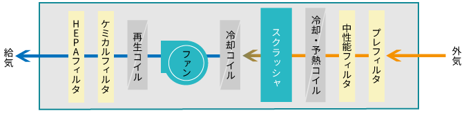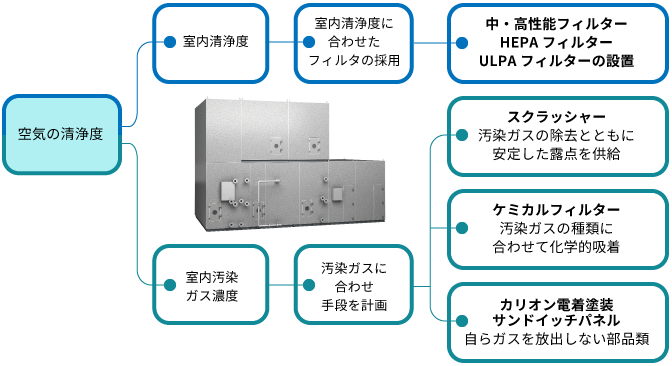 クリーンルームを構成するさまざまな機器の中でも、空調機(外調機)は特に重要な設備です。現在クリーンルームに求められているのは空気清浄度(クリーン度)とともに安定した温湿度や汚染ガスの除去です。