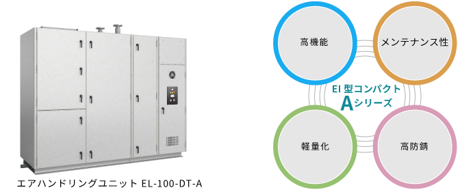 「EI型コンパクト Aシリーズ」はフレームの防錆力を向上し、現行機の約25%の軽量化を実現、またメンテナンス性に優れた空調機です。内部構造にも改良を加え、コンパクトかつ軽量なユニットなので、搬入や施工時の作業も容易です。