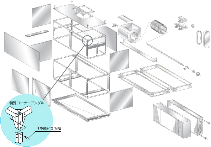 基本的には実績豊富な標準形空調機と同じ構造になっています。また工場では完全に組み立てた後、十分な検査を行い、出荷時に分解します。