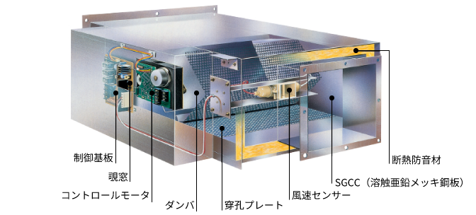 VAVシステムは、正確な風量を検出できるセンサがポイントです。VAV/CAVユニットに使用しているカルマンうず風速センサは理想的な比例特性を持っています。しかも、センサ内側には超音波(40kHz)の自己洗浄作用により、ほこりが付きません。