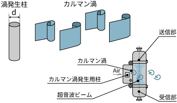カルマンうずとは流体の中におかれた柱状の物体の下流に発生するうずのことで、その発生周波数は流速に比例しています。 下の関係式は広範囲のレイノルズ数(3×102から2×105)で成立するため、流体の温湿度の影響を受けず、高精度な測定が可能です。機械的な可動部分がないため信頼性も向上し、設計寿命M.T.T.F.=1×105時間(温湿度10°C95%)を実現しています。カルマンうずは、うずの流れと直交した超音波ビームの信号の変化によって検出されます。信号は専用LSIでデジタル的に処理され変換による誤差はほとんど生じません。